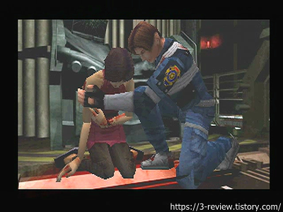 | 클레어: 이젠 힘들어! | 레온: 거기 있는 스위치를 눌러! |